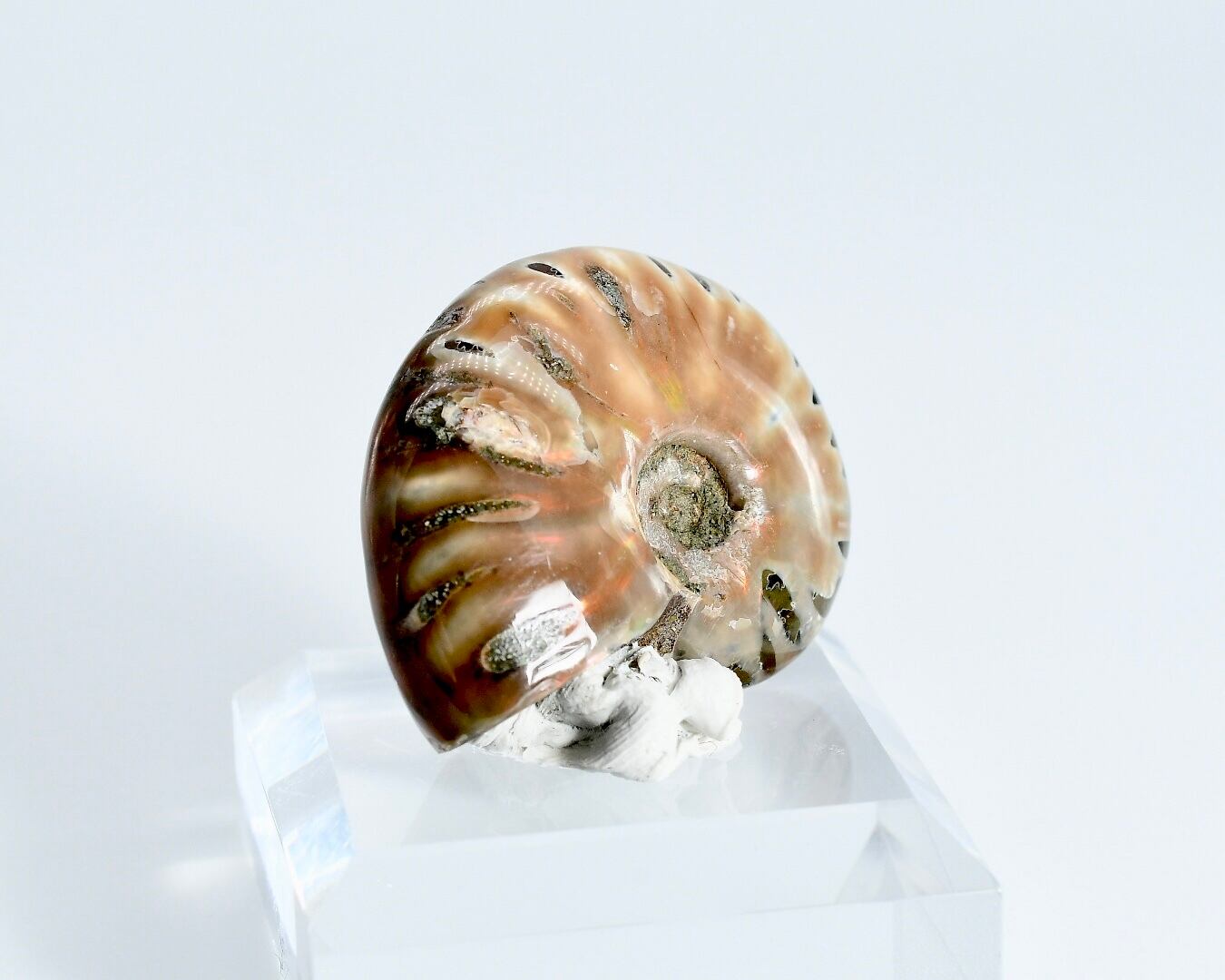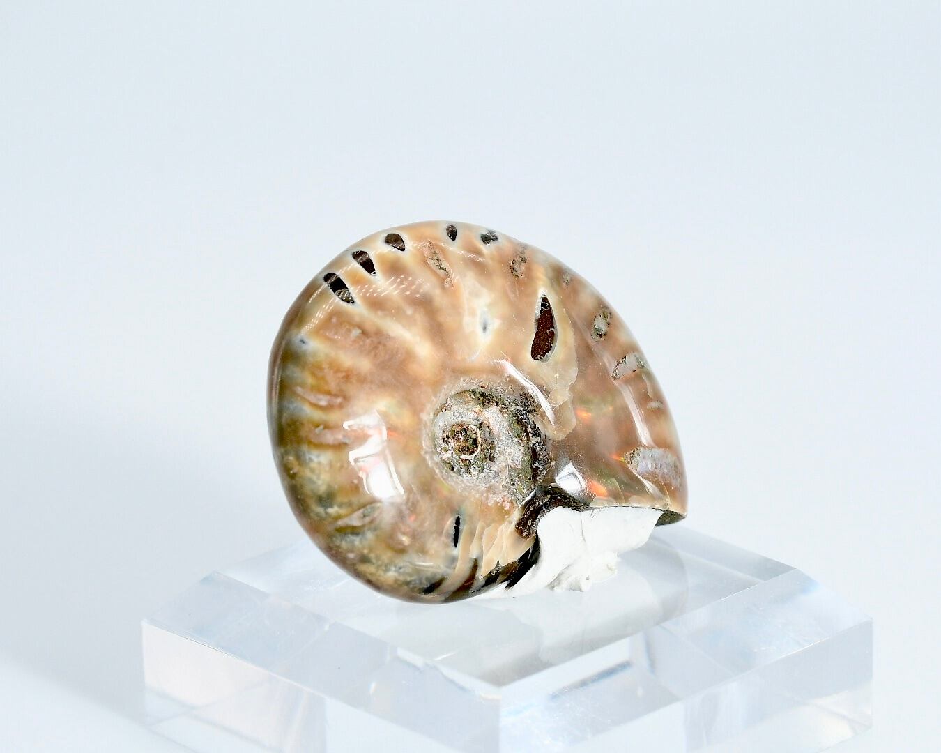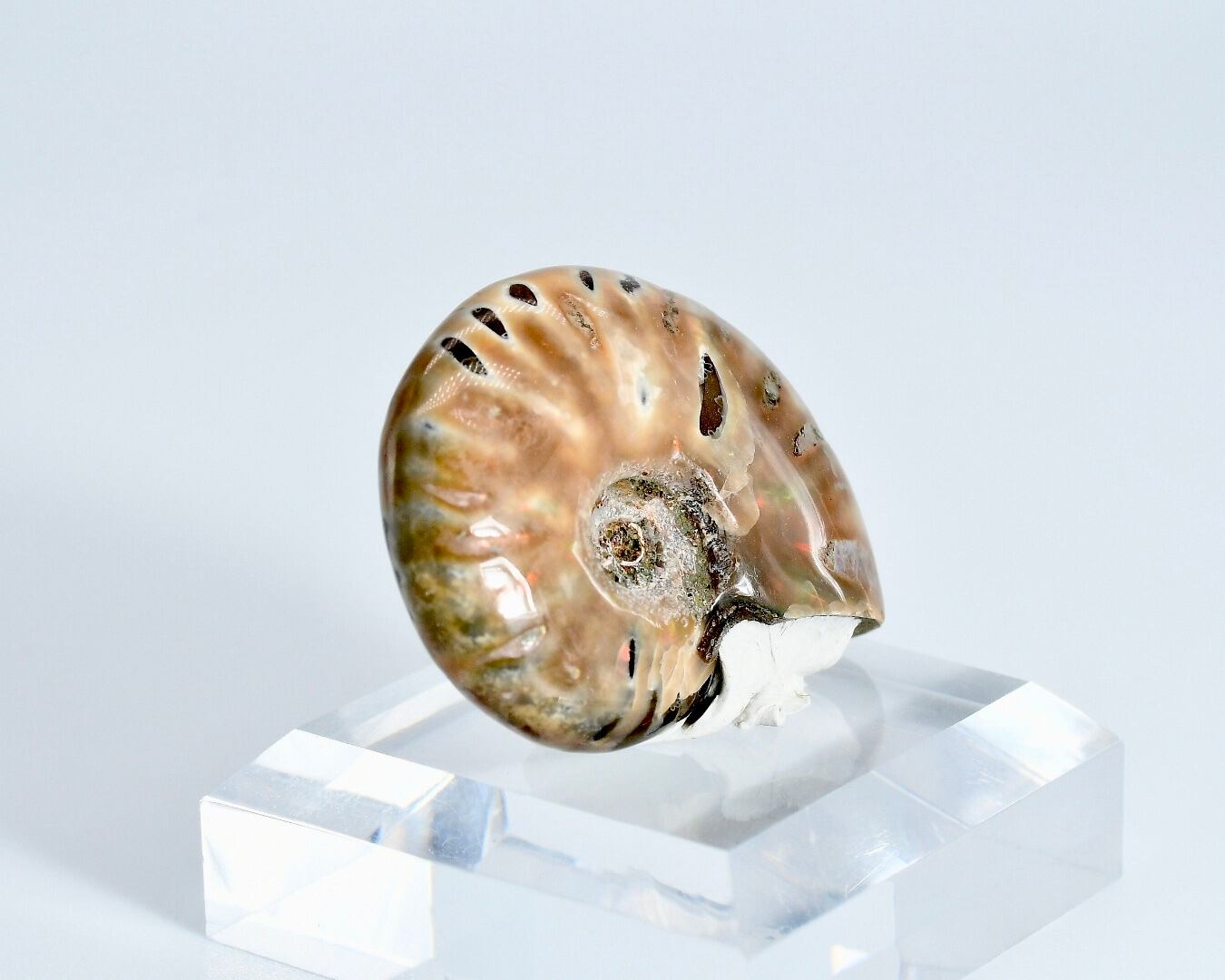 アンモナイト表面のアラゴナイト層(真珠層)が長年にわたり保存されて、周りの地圧、地質の影響を受けて、虹色の反射を輝かせています。