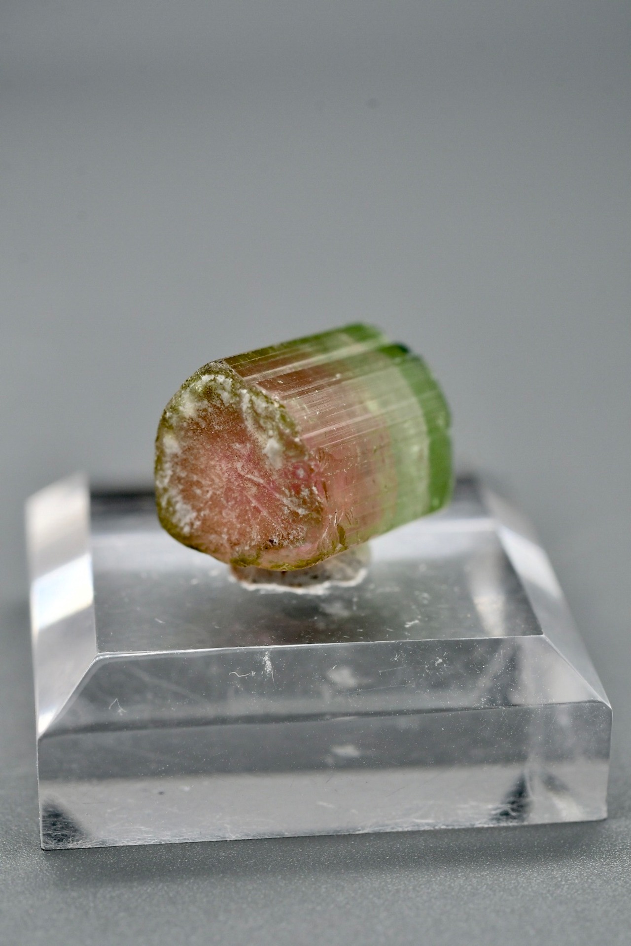 カットされていない通常のウォーターメロントルマリンは緑とピンクの色が重なるため、上下が分かれたバイカラーと肉眼で見える雰囲気が大きく異なります。
